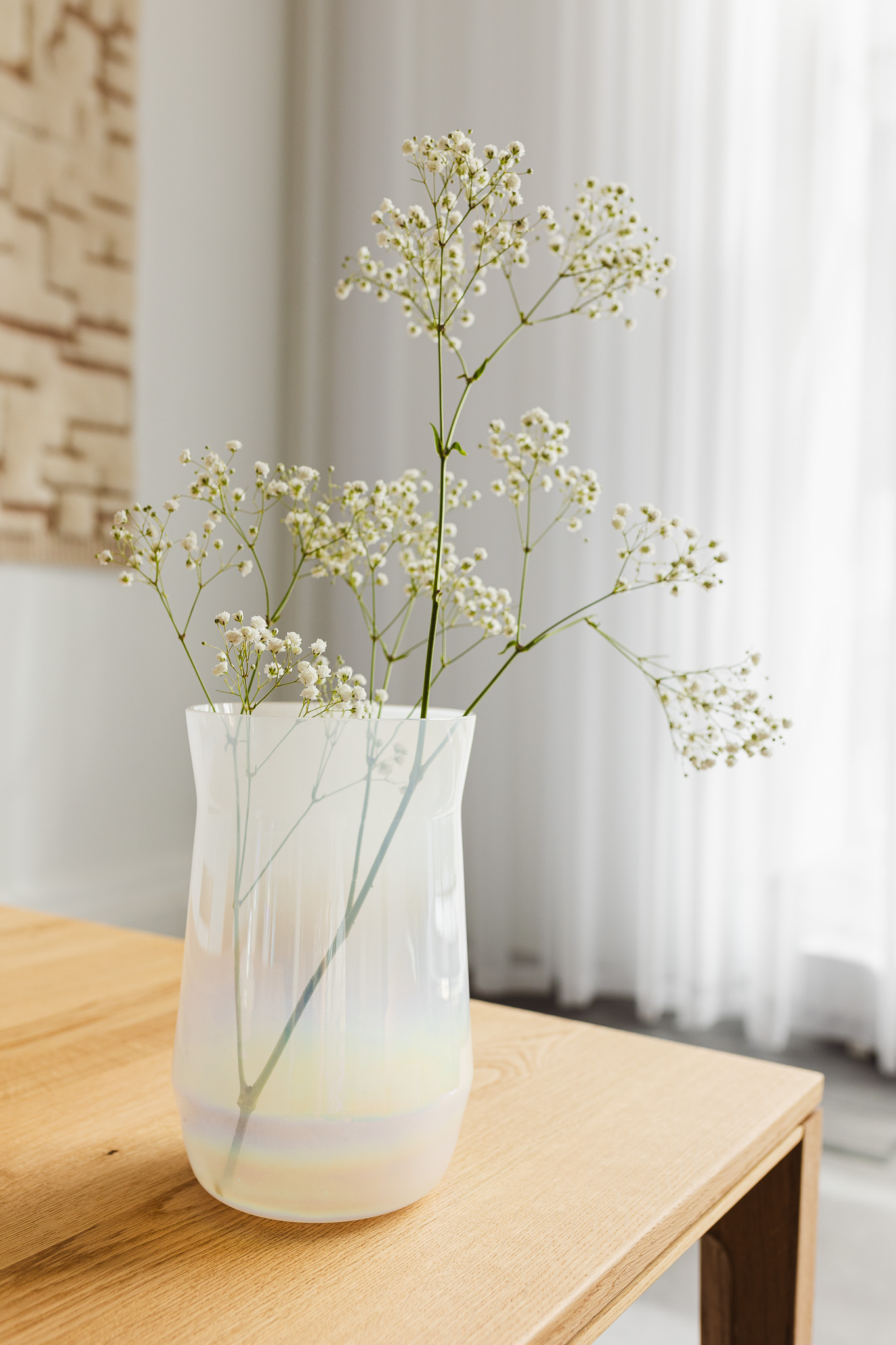 Jemné irisování dodává váze hloubku a proměnlivé odlesky, které mění atmosféru interiéru podle denního světla. Vynikne sama o sobě i s květinami.